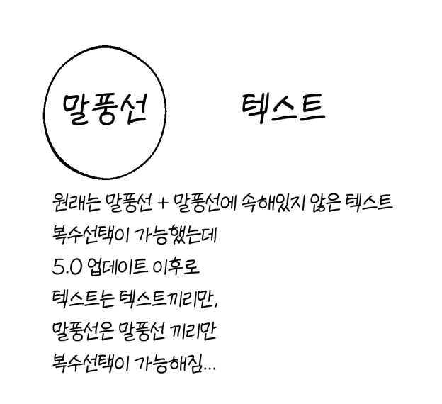 However, since the 5.0 update, speech bubbles can now only be selected with other speech bubbles, and text with other text. This is very inconvenient. If I select the text first, only the text inside the speech bubble can be selected, but if I select the speech bubble first, the text cannot be selected at all. Is there a setting error? Is this a bug?
